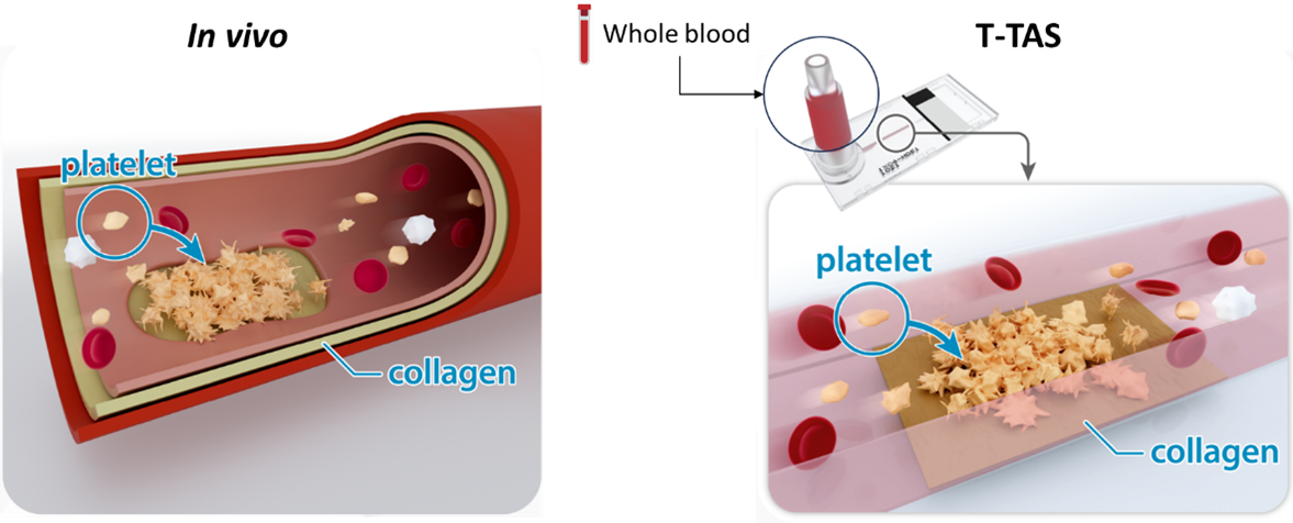 The T-TAS (Total Thrombus formation Analysis System) system and dedicated microchips were designed to simulate the response to blood vessel injury for ex vivo measurement of the thrombus formation process. When blood vessels are injured, platelets bind to exposed collagen under arterial flow conditions in a von Willebrand-factor dependent manner. The flow paths of the T-TAS microchips are coated with a thrombogenic surface, either collagen or collagen and tissue thromboplastin, which imitates the thrombogenic environment of damaged blood vessels.