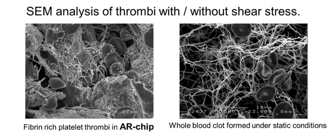 Because platelets are activated by shear stress caused by blood flow, thrombus formation under blood flow conditions contain numerous activated platelets, which thrombus formation under static conditions do not.