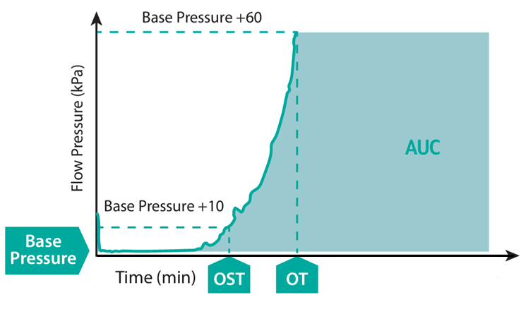 OST: Occlusion start time, The time when the pressure reaches 10 kPa above the baseline pressure (measured at the start of the assay).
